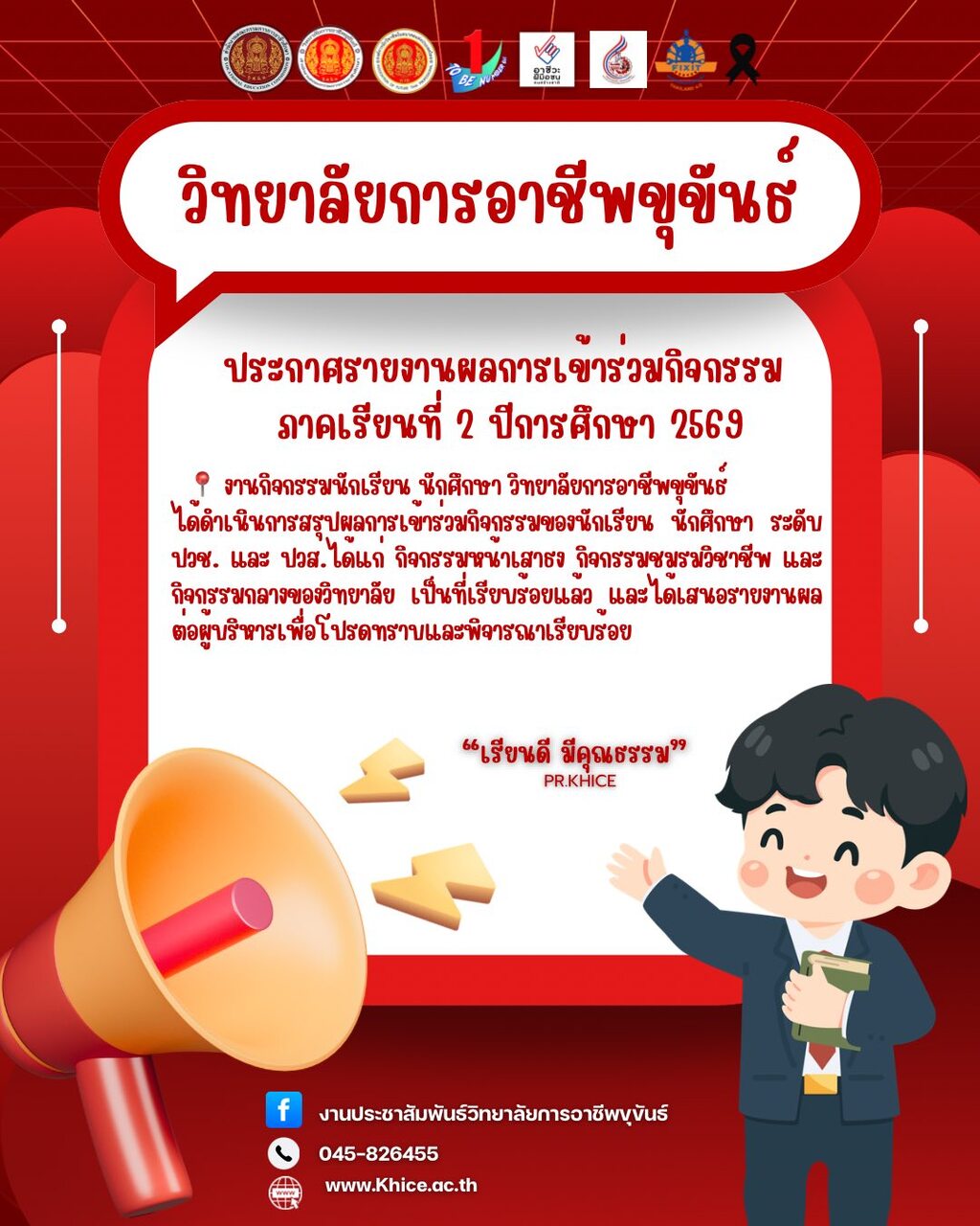 งานกิจกรรมนักเรียน นักศึกษา วิทยาลัยการอาชีพขุขันธ์ ได้ดำเนินการสรุปผลการเข้าร่วมกิจกรรมของนักเรียน นักศึกษา ระดับ ปวช. และ ปวส.ได้แก่ กิจกรรมหน้าเสาธง กิจกรรมชมรมวิชาชีพ และกิจกรรมกลางของวิทยาลัย เป็นที่เรียบร้อยแล้ว และได้เสนอรายงานผลต่อผู้บริหารเพื่อโปรดทราบและพิจารณาเรียบร้อย